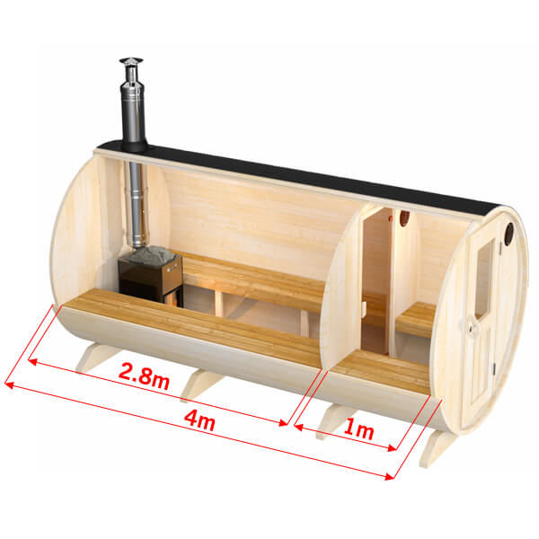 Saunahuone 280cm, pukuhuone 100cm, suositus 6-8 hengelle
